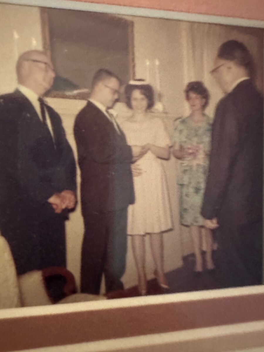 Our wedding consisted of Dottie and I as bride and groom, Her sister as Maid of Honor, Her dad as Minister, Her mother as pianist and her brother-in-law as camera man. That was our entire wedding party so it was the group plus the cameraman which means we had a wedding with only one guest and we made him take pictures. Late in 1961 i saw this beautiful waitress in the NSU cafeteria and I looked first at my girlfriend and then back to the waitress and I said in my heart, Ï am going to marry this girl.¨ Winning her heart was not easy but here we are and I love Dottie much more than I loved her that day in 1961.